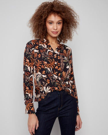 Printed Long Sleeve Button Down Shirt With Twisted Front